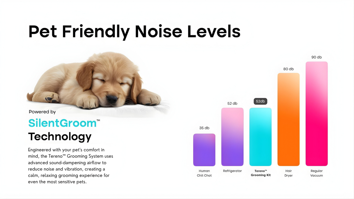 Tereno’s SilentGroom™ Technology is designed for calm, gradual desensitization. Unlike loud vacuums that trigger fear, SilentGroom™ produces a soft, low-frequency hum that even anxious dogs can tolerate. Within days, grooming becomes a positive, bonding routine instead of a chore.