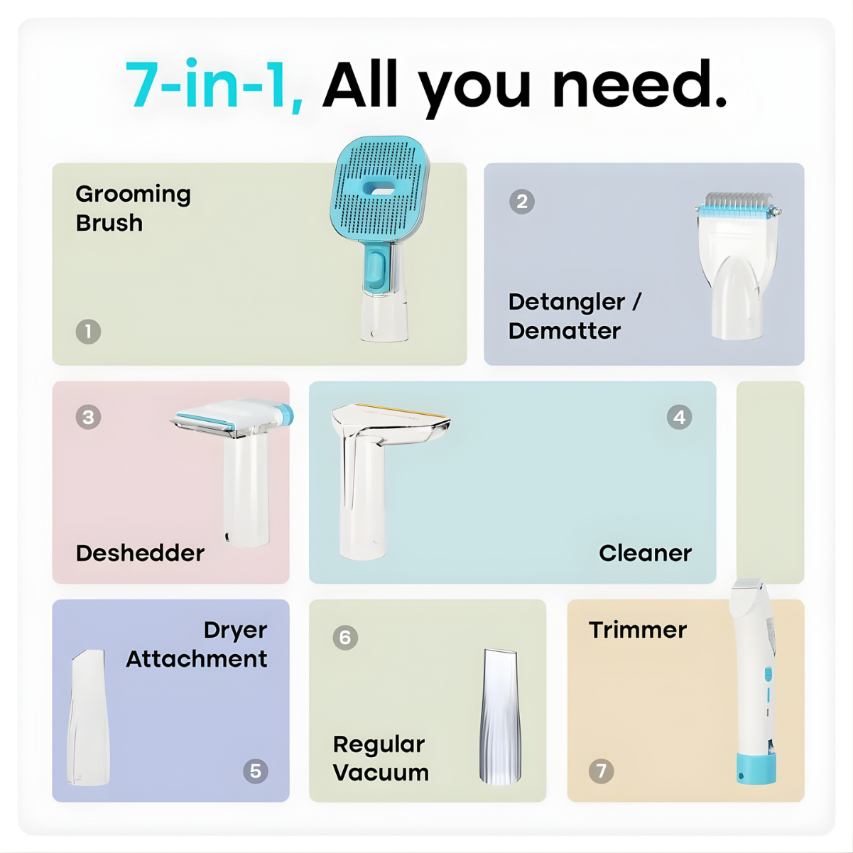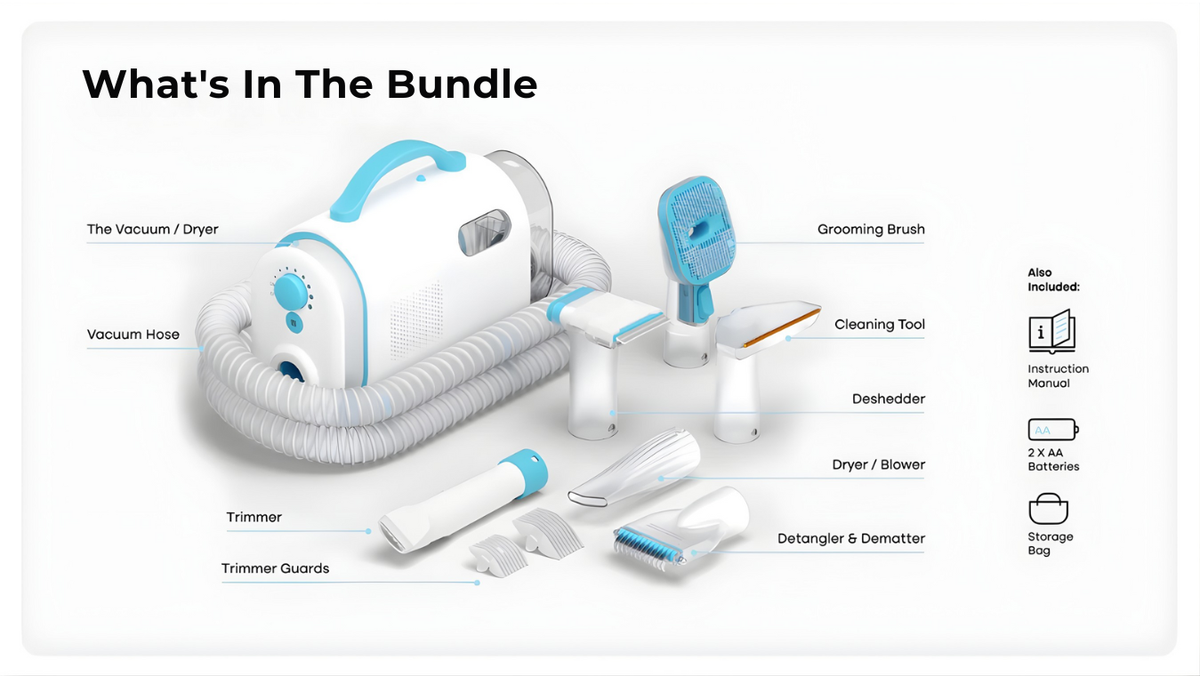 The Tereno™ Calm Grooming Bundle combines quiet power, deshedding precision, and salon-level finishing into one system. You get every attachment needed to groom, clean, and style your pet without extra purchases or stress.
