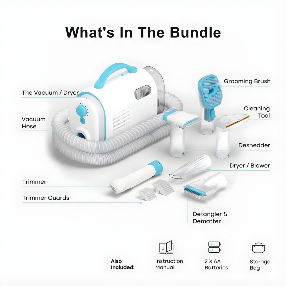 - Deshedding Kit (brush, nozzle, detangler)